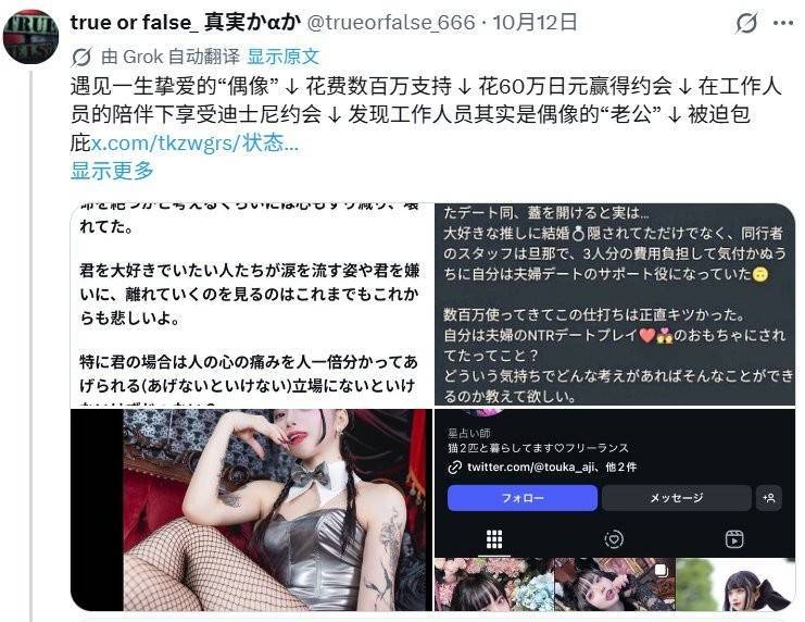 以下那位粉丝的自述,“那一场活动花费大约60万日元,在约会的同时我看到的真相却是...我最爱的偶像不仅仅隐瞒了婚姻,陪同她的工作人员也是她的丈夫,最后由我承担了三人的费用,在不知不觉中,我支持了他们夫妻俩的约会。说实话花了几百万日元,却受到了如此对待真的太难受了。也就是说我成了她跟她老公玩NTR约会play的梗了吗?到底是出于怎样的心情、感受以及想法才能做出这样子的事情啊!”