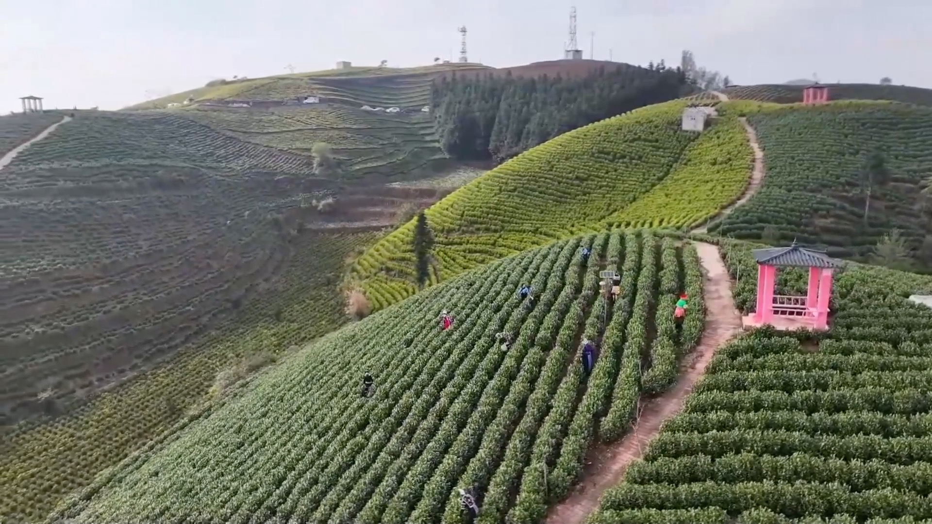 走进分会场黔西南州安龙县,茶山上一派繁忙景象。参加采茶比赛的选手们腰挎竹篓,在“一捏一提一放”间比拼采摘速度与鲜叶品质。